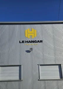 Le logo du Hangar Training a été réalisé en dibond 3 mm, un matériau rigide et durable, associé à un film adhésif anti-UV pour garantir une bonne tenue des couleurs dans le temps. Deux formats ont été posés : un grand panneau de 4 m x 3 m pour une visibilité maximale, complété par un panneau plus petit de 2,50 m x 1,50 m pour renforcer la signalétique. La pose a été entièrement réalisée par les équipes de FK Pub, assurant un rendu professionnel et soigné.